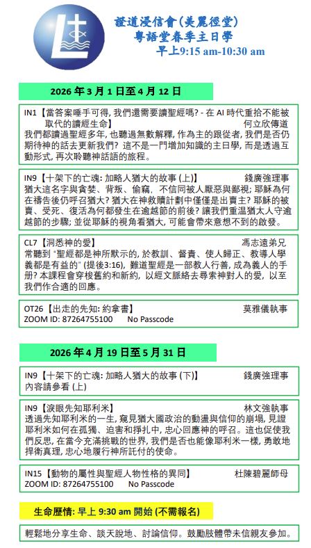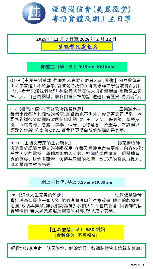 以下是我們所推介的各類課程、講座及活動。弟兄姊妹可以按自己的興趣參與,繼續在神的話語中追求並成長,活出基督的樣式。